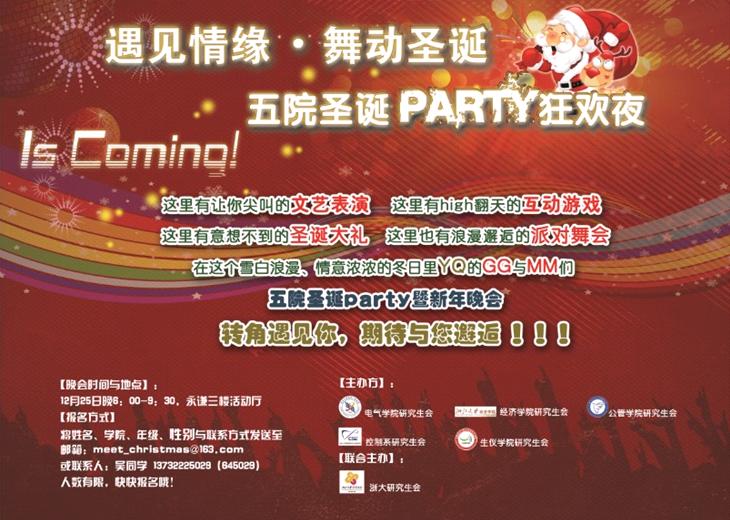 3750 p class="MsoNormal" style="margin: 0cm 0cm 0pt; text-indent: 24pt">浓浓冬意,暖暖深情。值此圣诞与新年来临之际,为了加强校内院系间的交流,增进不同院系同学间的友谊,经济学院研究生会与电气学院研究生会、控制系研究生会、公管学院研究生会以及生仪学院研究生会五院联合打造2012圣诞PARTY暨新年舞会,为玉泉校区的广大男女搭建一个交流联谊的舞台。