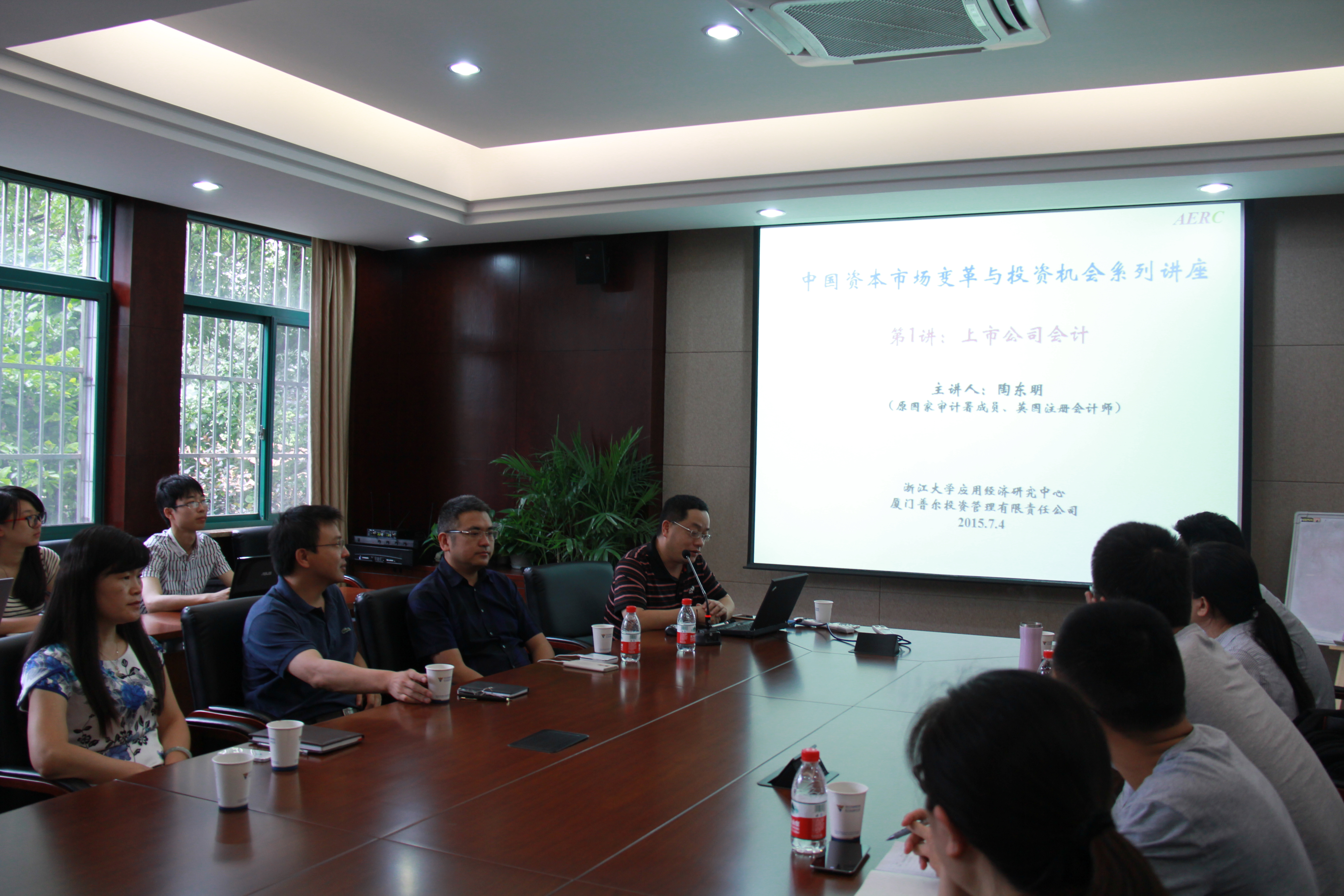 2015年7月4日,由浙江大学应用经济研究中心与厦门普尔投资有限责任公司共同举办的“中国资本市场变革与投资机会系列沙龙”活动(第一场)在经济学院举行,浙江大学应用经济研究中心副主任王义中副教授主持了活动,浙江大学校友、英国特许公认会计师、资深审计专家陶东明以《上市公司会计制度》为题主讲。围绕上市公司会计问题,并结合案例和实际操作,详细介绍了互联网时代的会计、上市公司会计与审计、会计的国际化差异、重组和公允价值和中国和国际准则的差异。