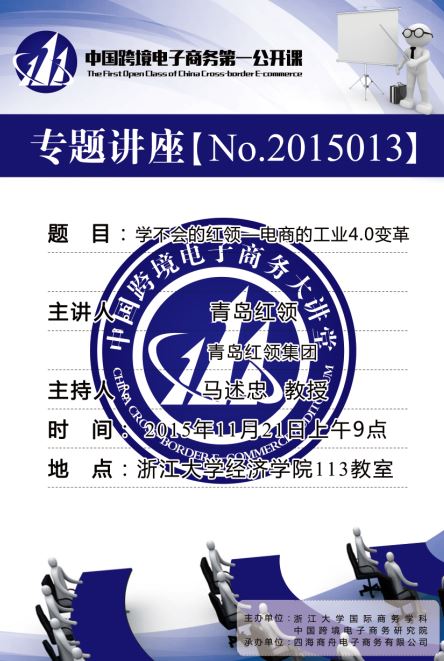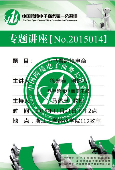 专题讲座第一场: 主题:学不会的红领—电商的工业4.0变革 主讲嘉宾:青岛红领集团 主持人:马述忠教授 时间:11月21日(周六)上午9点 地点:浙江大学玉泉校区外经贸楼113教室 专题讲座第二场: 主题:小马看跨境 主讲嘉宾:徐鼎鑫 鼎堃跨境电商俱乐部创始人 主持人:马述忠教授 时间:11月21日(周六)下午2点 地点:浙江大学玉泉校区外经贸楼113教室