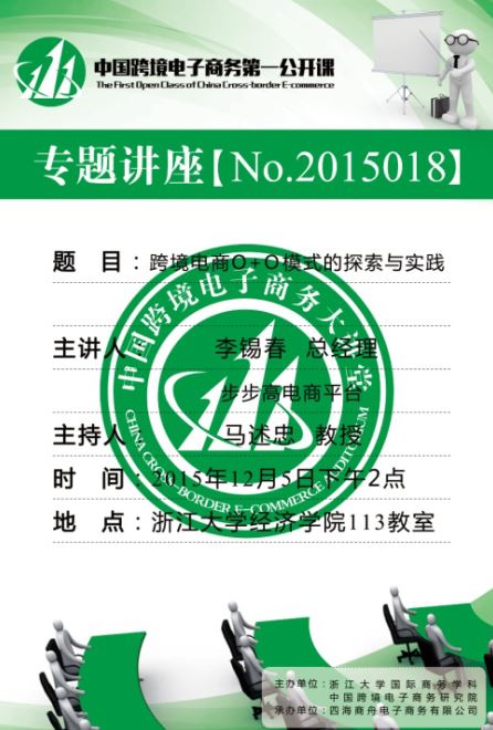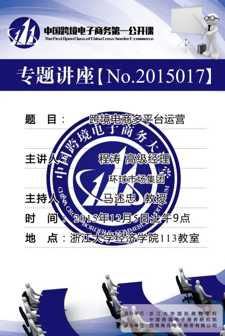 跨境电商的平台和模式 专题讲座第一场: 主题:跨境电商多平台运营 主讲嘉宾:程涛 环球市场集团高级经理 主持人:马述忠教授 时间:12月5日(周六)上午9点 地点:浙江大学玉泉校区外经贸楼113教室 专题讲座第二场: 主题:跨境电商O+O模式的探索与实践 主讲嘉宾:李锡春 步步高电商平台总经理 主持人:马述忠教授 时间:12月5日(周六)下午2点 地点:浙江大学玉泉校区外经贸楼113教室