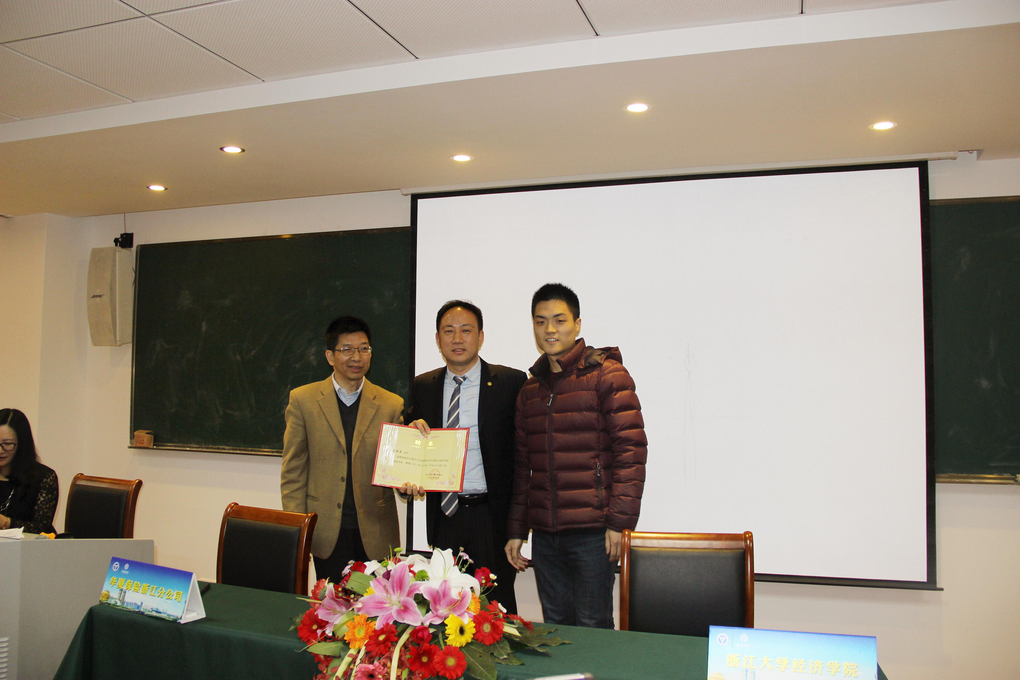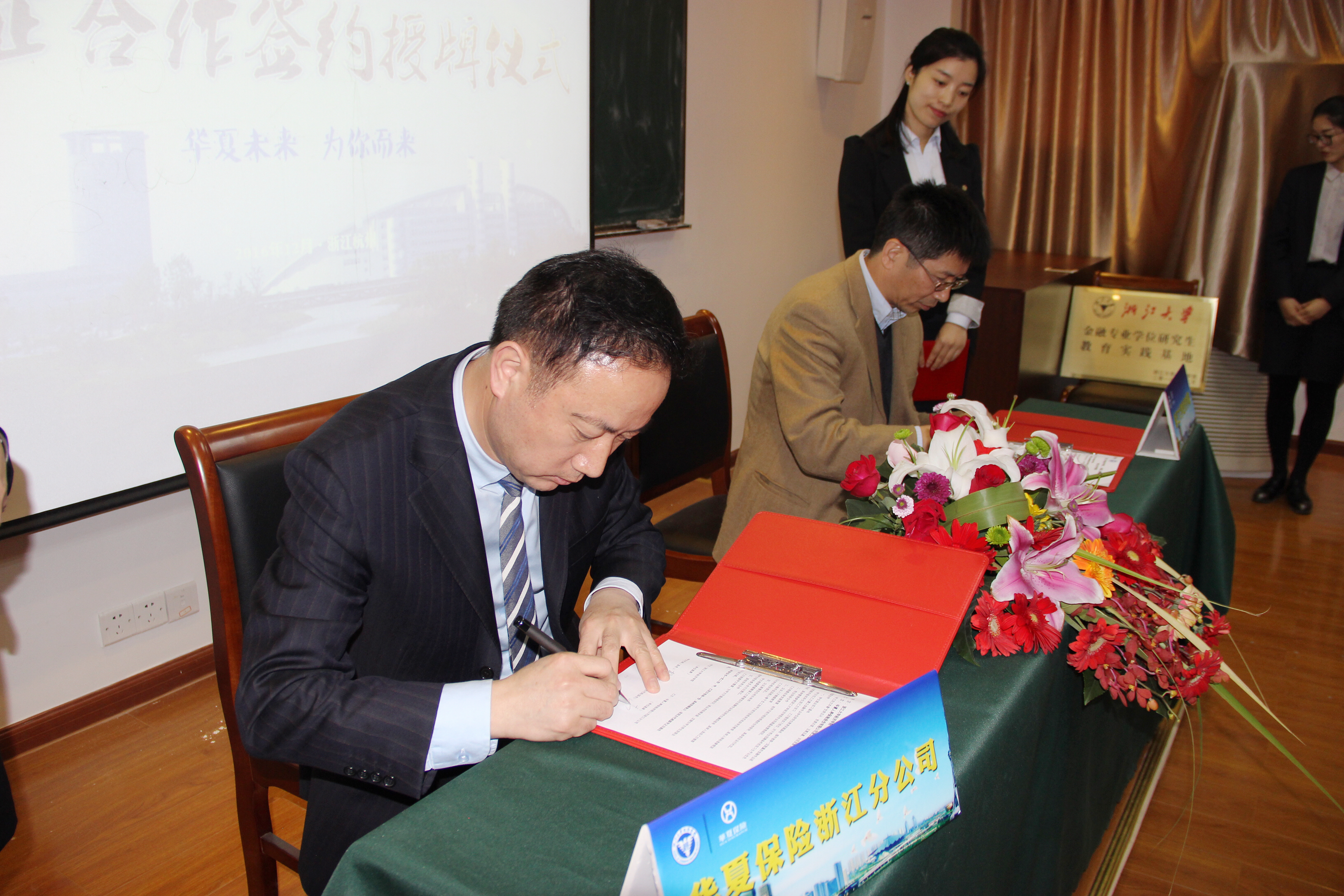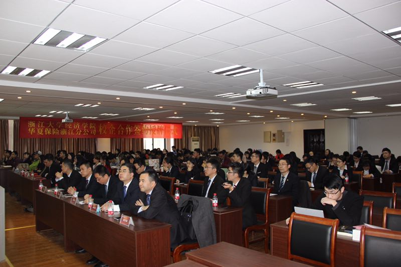 出席本次签约仪式的校方领导有浙江大学经济学院副院长杨柳勇教授、金融系副主任俞洁芳、朱燕建老师,经济学院专业学位委员会秘书齐爱玉和研究生科科长余若燕以及金融系的教师、学生90余人,以及浙江分公司总经理曹祥涛、银保渠道负责人段建福,携分公司各部门长及管理本部内勤员工50余人出席。