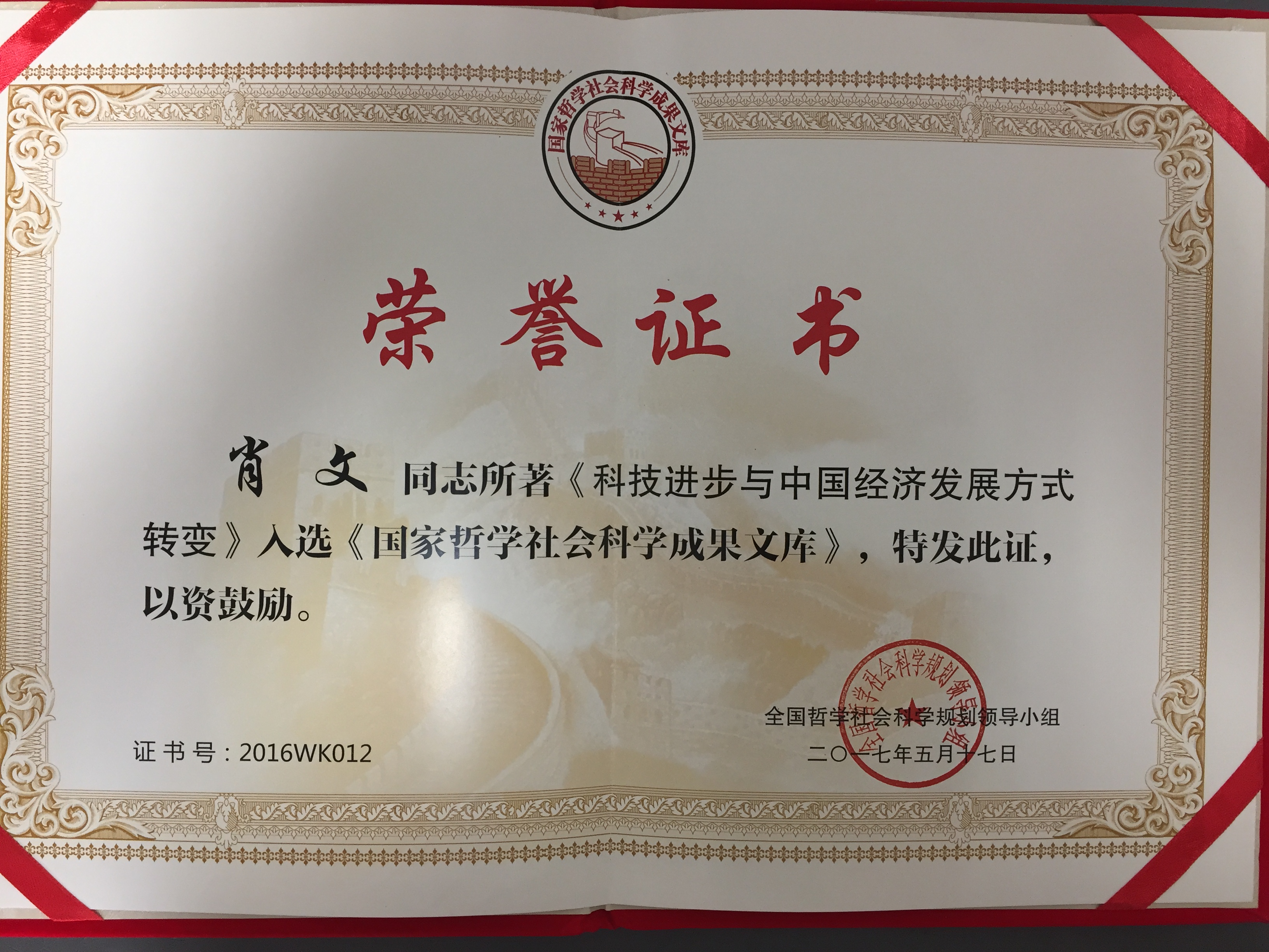 会议表彰了2016年度《国家哲学社会科学成果文库》入选作品, 全国哲学社会科学规划领导小组向入选作品的作者颁发荣誉证书。我院肖文教授的专著《科技进步与中国经济发展方式转变》入选了2016年度《国家哲学社会科学成果文库》,由人民出版社公开出版发行,在会上受到了表彰。该书系肖文教授主持的国家社科基金重大项目“深入贯彻落实科学发展观加快经济发展方式转变”的最终成果(免鉴定结题),入选《国家哲学社会科学成果文库》,是对其在社科领域成就的一种至高肯定,亦是我院成果首次入选成果文库,具有重要意义。