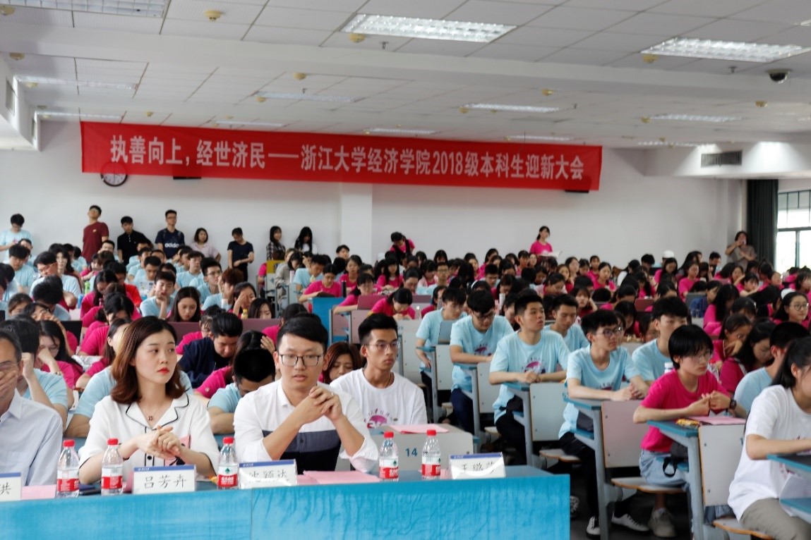 1100 div align="left" style="text-indent: 24pt; line-height: 150%;">5月31日下午,浙江大学经济学院2018级本科生迎新大会于紫金港校区东2-202隆重召开。浙江大学经济学院院长黄先海、党委书记张子法、党委副书记卢飞霞出席大会,各系主任及班主任、辅导员一同参加,共同欢迎浙江大学经济学院18级本科生进入学院。大会由卢飞霞副书记主持。