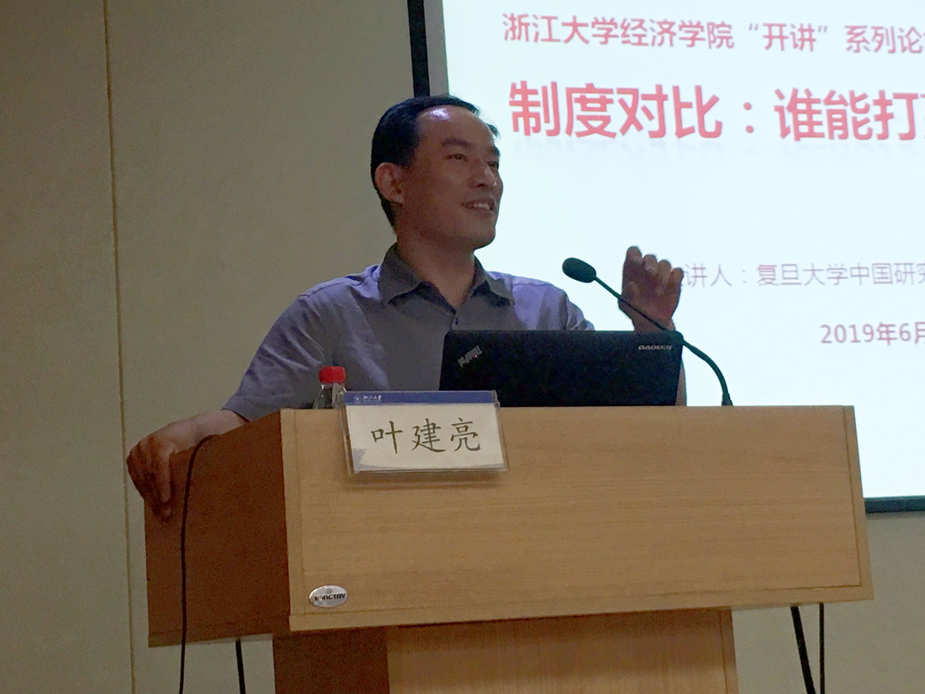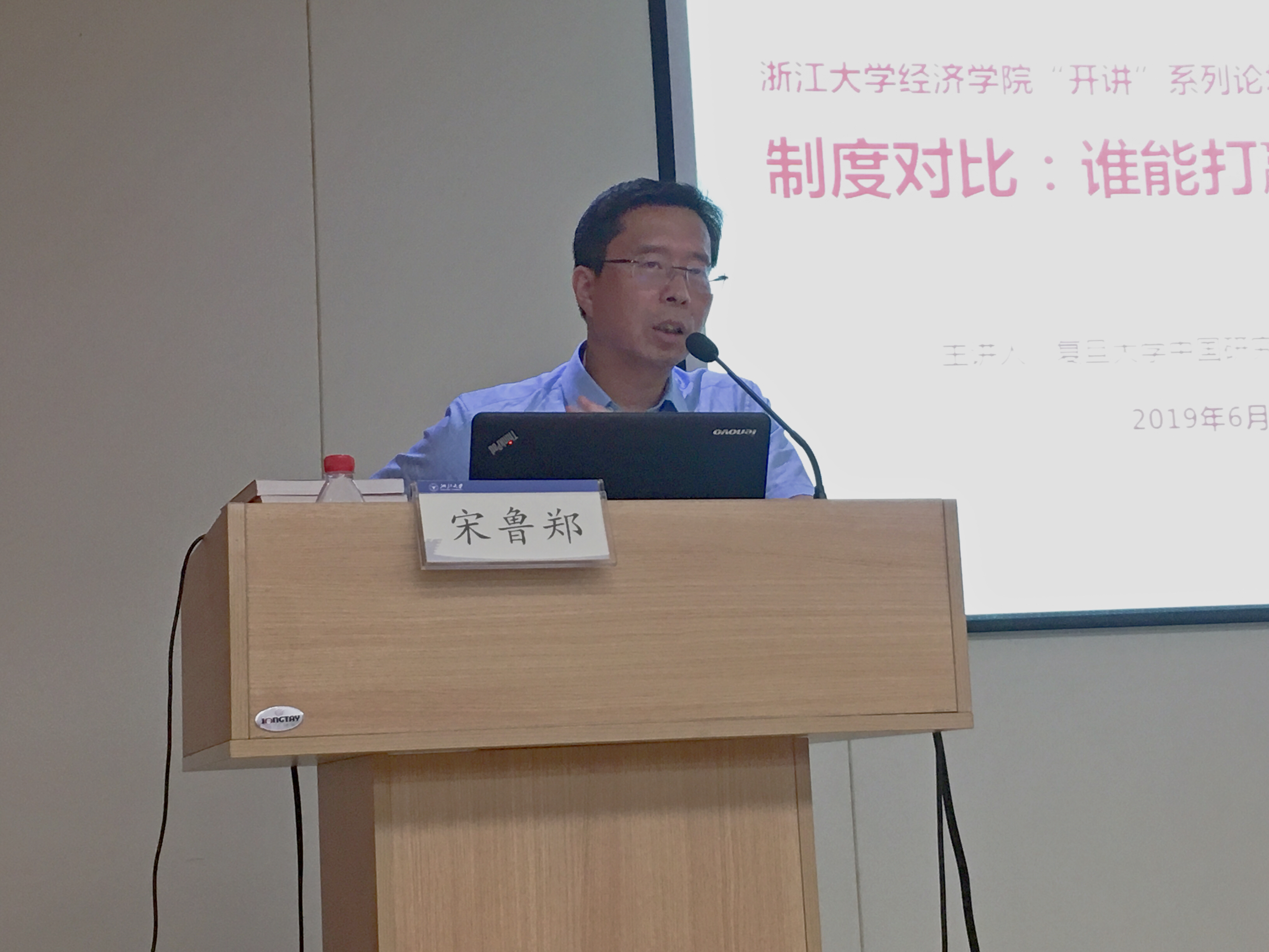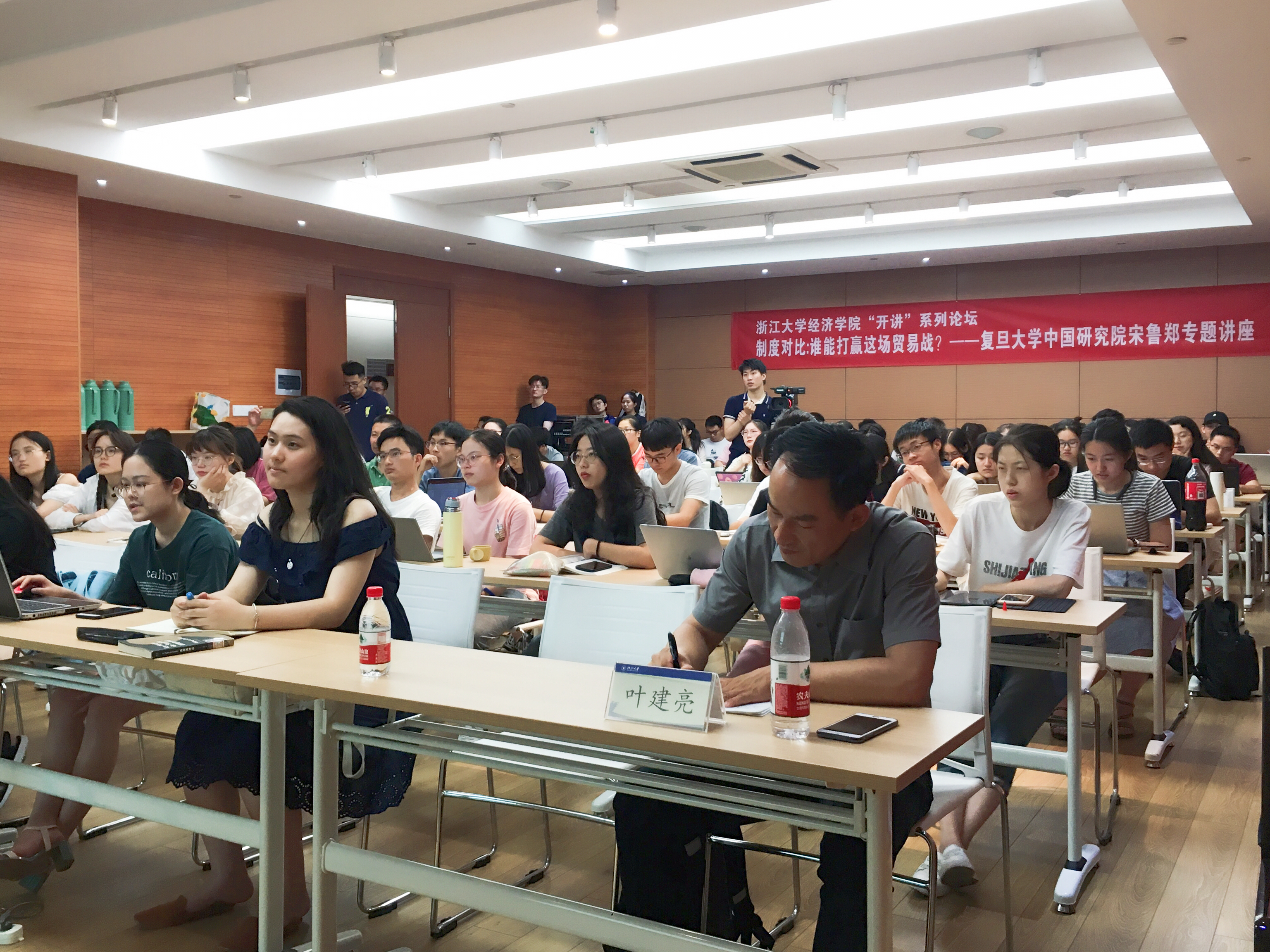 949 p style="text-align: left;"> 2019年6月12日,经济学院“开讲”系列论坛之复旦大学中国研究院宋鲁郑研究员专题报告会在浙江大学紫金港校区校友楼西溪厅顺利举行。在题为“制度对比:谁能打赢这场贸易战”的主题报告中,宋鲁郑研究员详细分析了中美贸易战的起因和走向,并就世界和中国经济各方面的问题与老师和同学们进行了交流。报告会由经济学院经济学系副系主任叶建亮副教授主持。