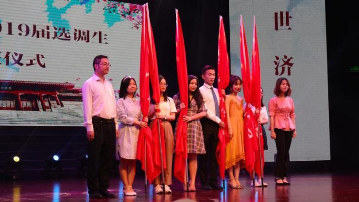 在2019届选调生出征仪式中,校团委副书记梁艳老师和经济学院副院长方红生老师共同为选调生代表们授旗。他们,即将扎根基层,挥洒青春,在台上接过的是旗,更是沉甸甸的责任。