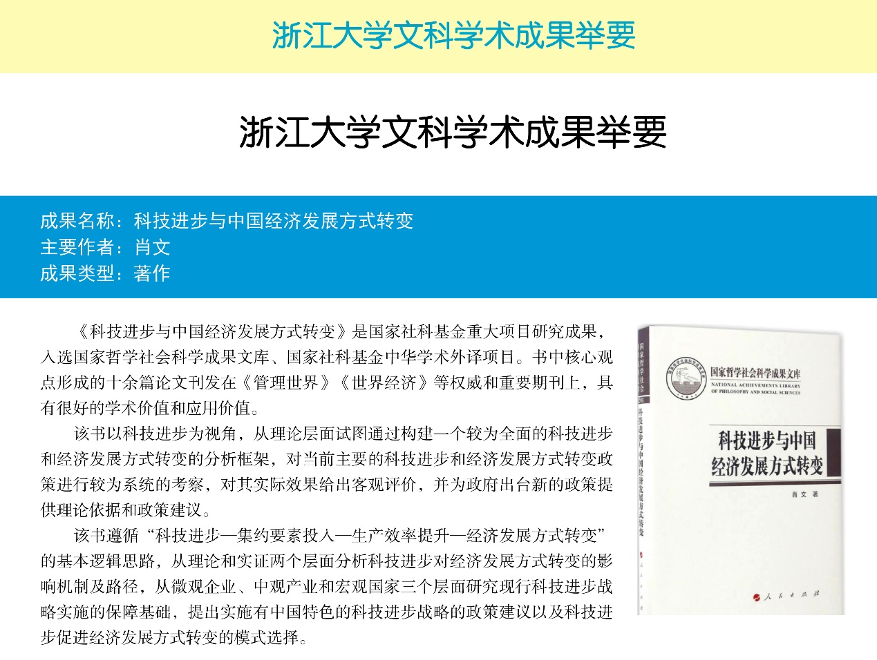 385 浙江大学学报2020年首期文科成果举要发布,我院肖文教授的专著《科技进步与中国经济发展方式转变》被收录。