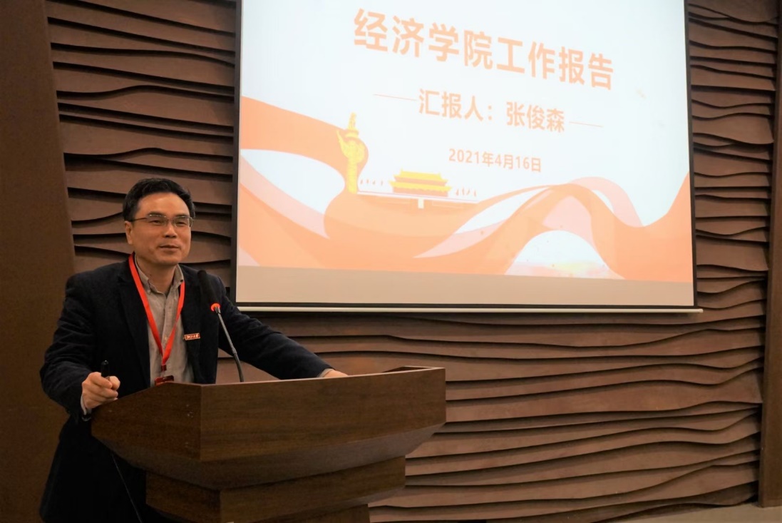 预备会议之后,大会在庄严的国歌声中拉开序幕。院长张俊森代表学院作了题为“谋篇十四五,聚焦新发展,开启迈向世界一流经济学院前列新征程”的学院工作报告,总结了自五届二次“双代会”以来学院的党建工作、师资队伍、教育教学、学生思政、学科建设、科学研究、国际交流、社会服务、工会工作等方面所取得的成绩。他指出,学院在这两年中积极推进“双一流”建设,实现了跨越式发展,国内外排名大幅提升,在英国泰晤士高等教育2020年大学排行榜上,经济学与商科学科位居全球第50位,位列中国大陆地区第3位;在英国QS世界大学2020年学科排名中,经济学与计量经济学、金融学与会计两大学科,双双进入世界前100名,是中国大陆地区五所进入前百的高校之一;在最新公布的ESI排名中,经济与商业学科位于全球前1%。2021年,学院将继续深入贯彻落实党的十九大精神,紧密围绕学校“双一流”建设部署,以发展为核心,以人才培养和学科建设为中心,以师资队伍建设为重点,以深化学院综合改革为支撑,以聚集办学资源为保障,坚定走向世界一流学院前列。