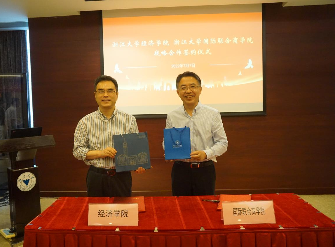 在经济学院党委书记兼副院长张子法,副院长王义中,党委副书记、纪委书记卢飞霞,以及国际联合商学院副院长瞿海东、院长助理雷李楠、沈莉的共同见证下,张俊森和贲圣林代表双方签署战略合作协议,并互赠纪念品。