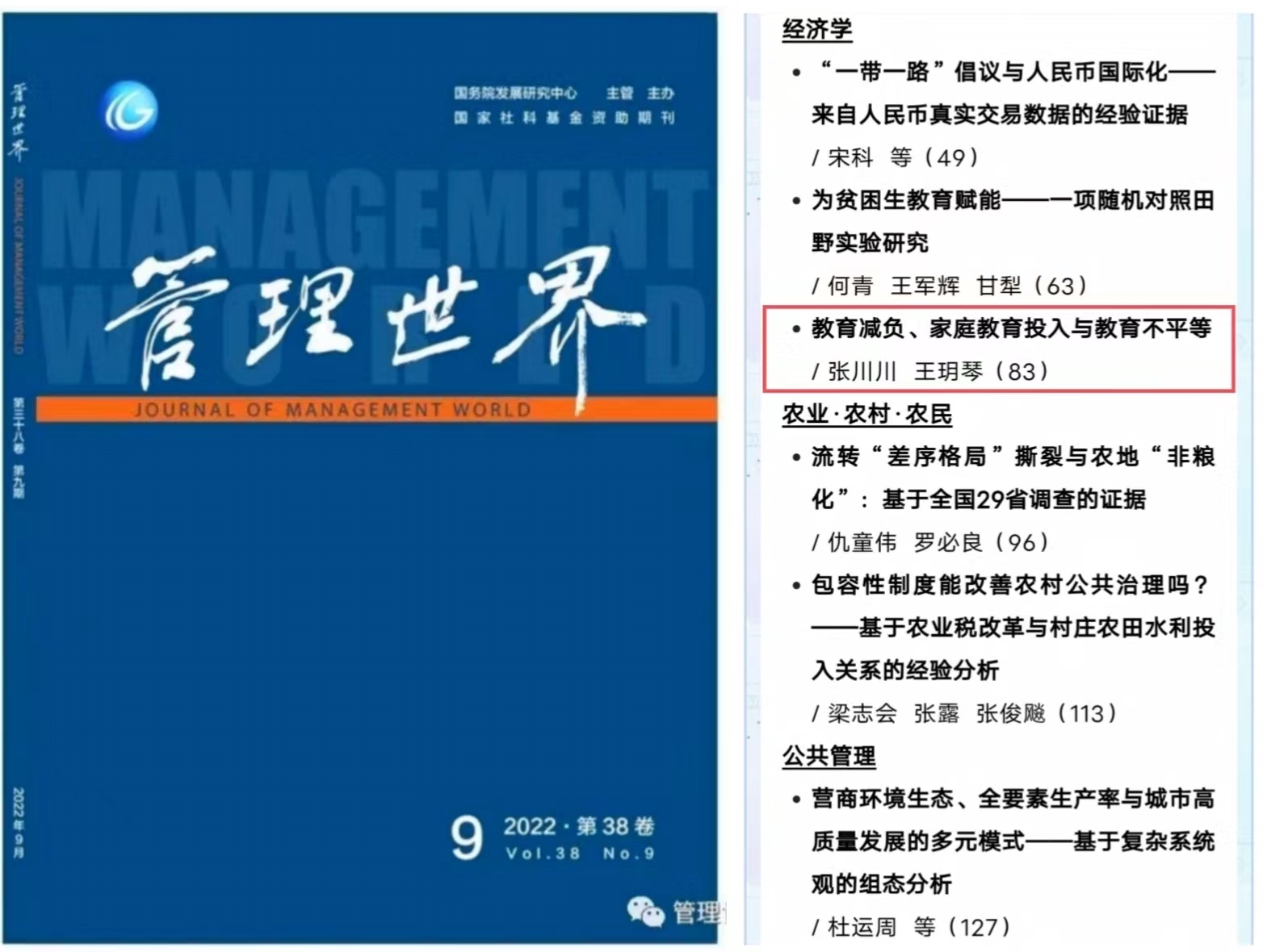 679 近日,浙江大学经济学院百人计划研究员张川川老师和四川大学经济学院王玥琴合作的论文《教育减负、家庭教育投入与教育不平等》,在《管理世界》2022年第9期正式发表。