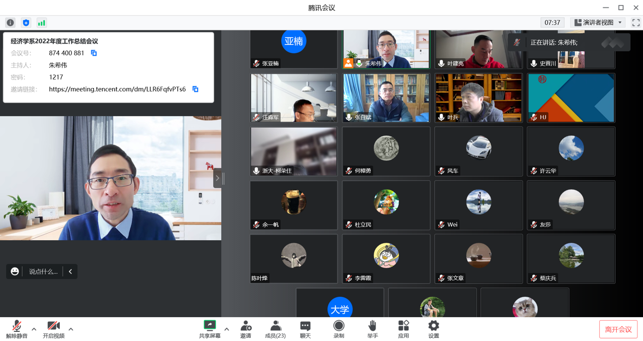 183 12月17日上午,经济学系2022年度教学科研工作总结会议在腾讯会议线上顺利召开。会议由经济学系主任朱希伟教授主持,参会人员为经济学系全体教师。