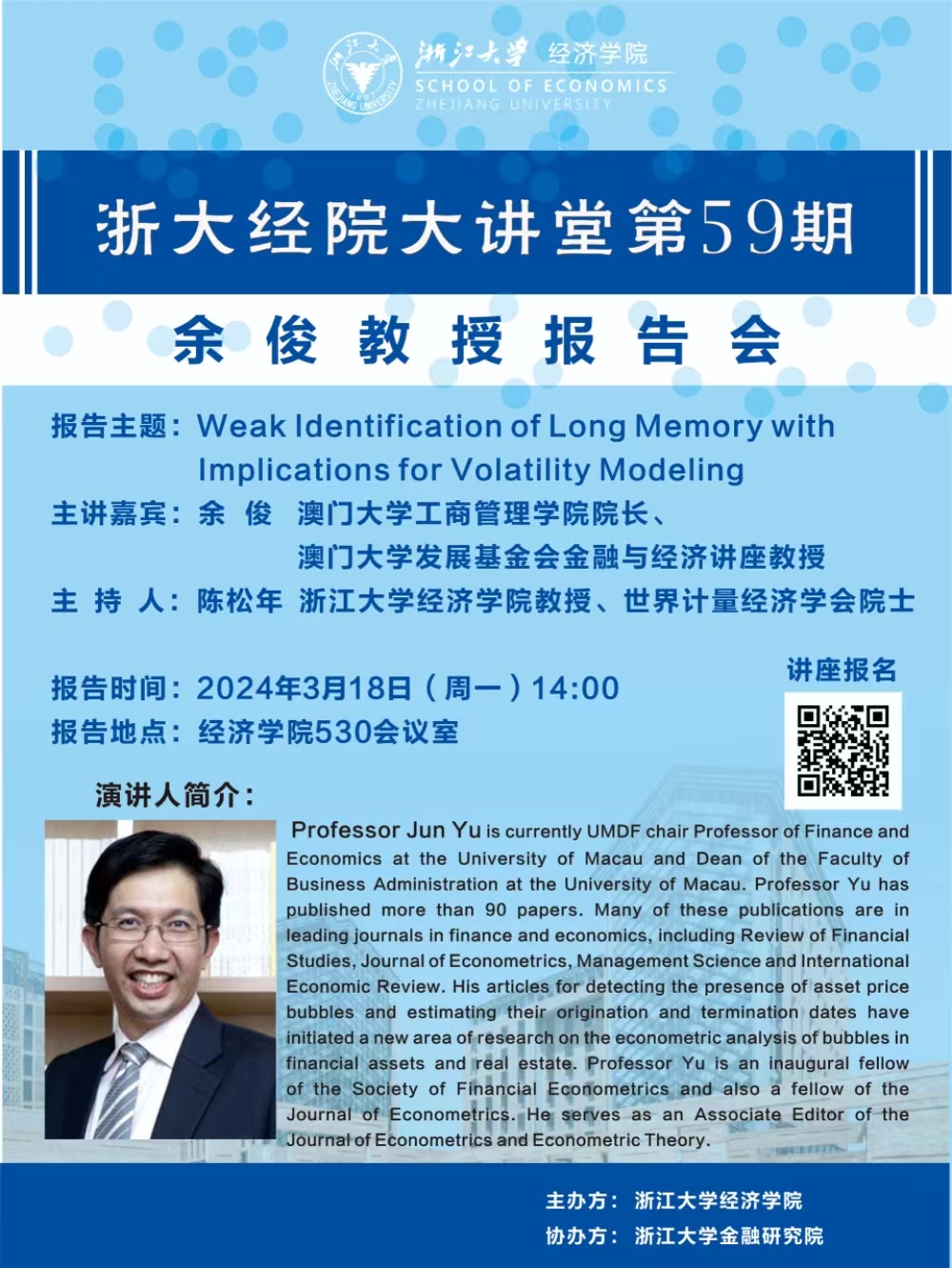 【浙大经院大讲堂第59期】余俊: Weak Identification of Long Memory with Implications for Volatility Modeling