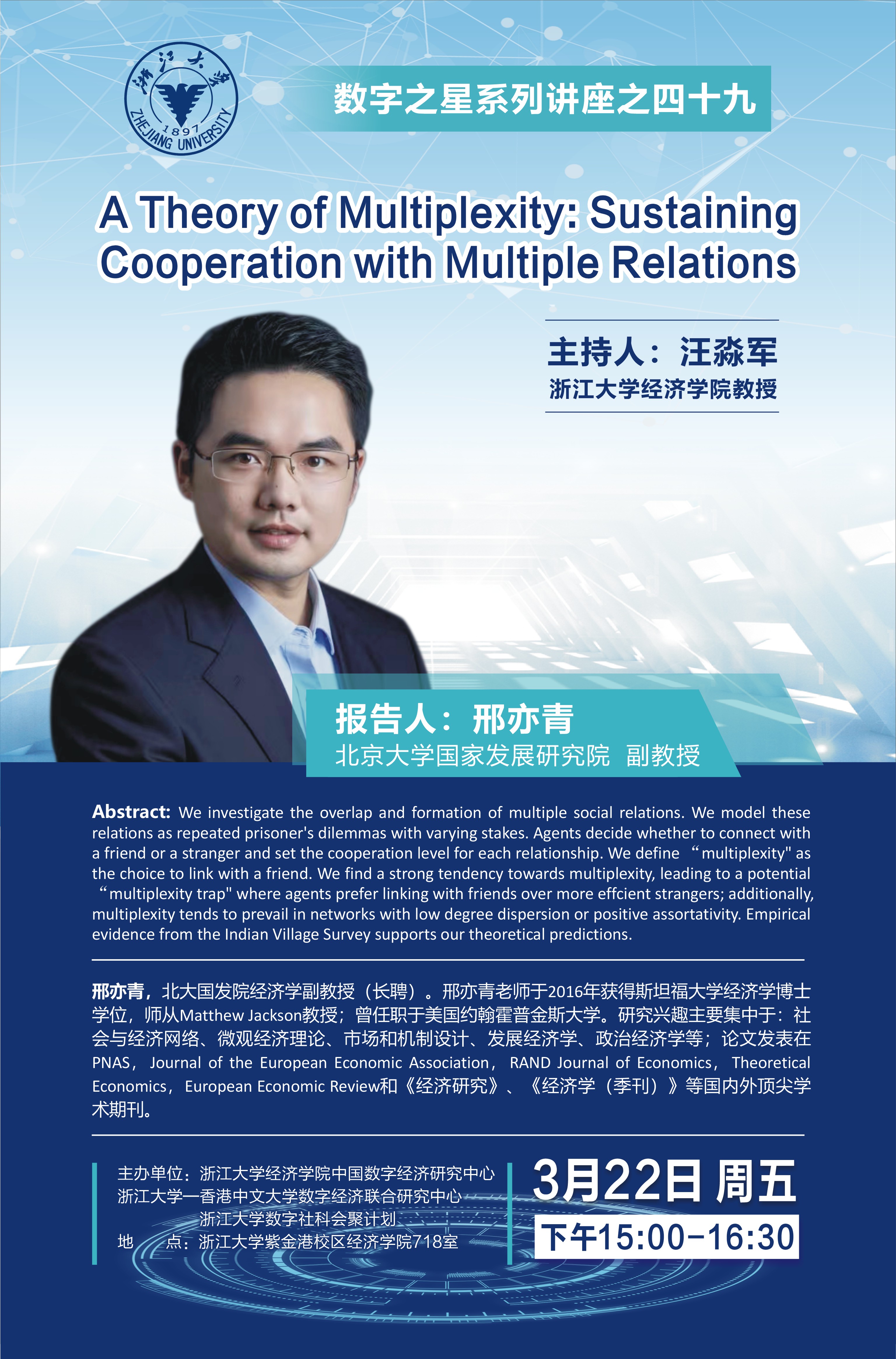 [数字之星系列讲座之四十九]邢亦青:A Theory of Multiplexity: Sustaining Cooperation with Multiple Relations