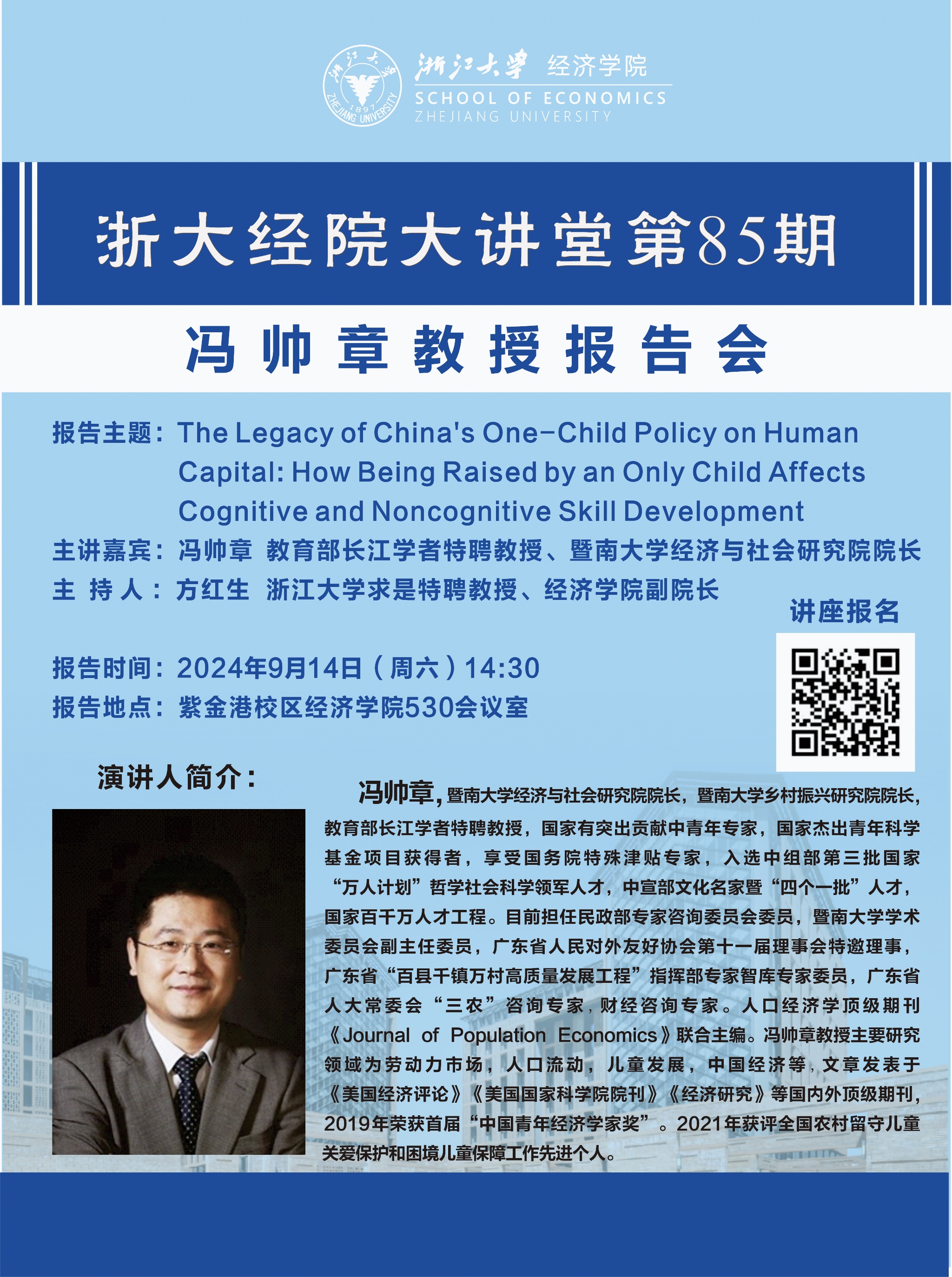 【浙大经院大讲堂第85期】冯帅章: The Legacy of China’s One-Child Policy on Human Capital: How Being Raised by an Only Child Affects Cognitive and Noncognitive Skill Development