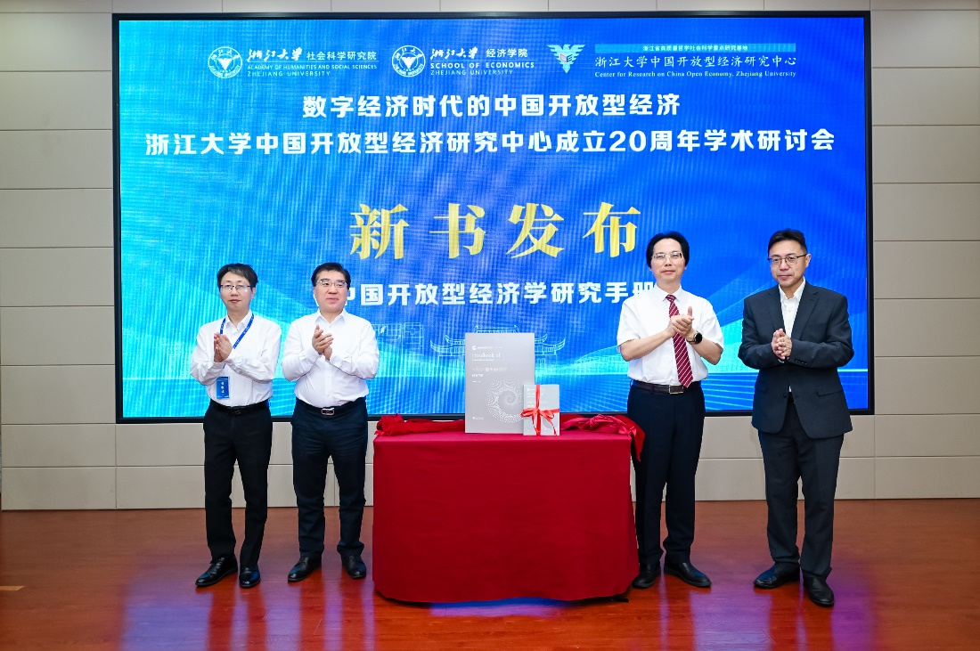 在随后进行的新书发布环节,黄先海、盛斌、苗建军、徐宝敏共同为《中国开放型经济学研究手册》揭幕。该著作是浙江大学推动中国经济学自主知识体系构建的重要成果之一,系统梳理并总结了开放经济领域的理论进展与中国实践,是该研究领域的一部标志性工具书。