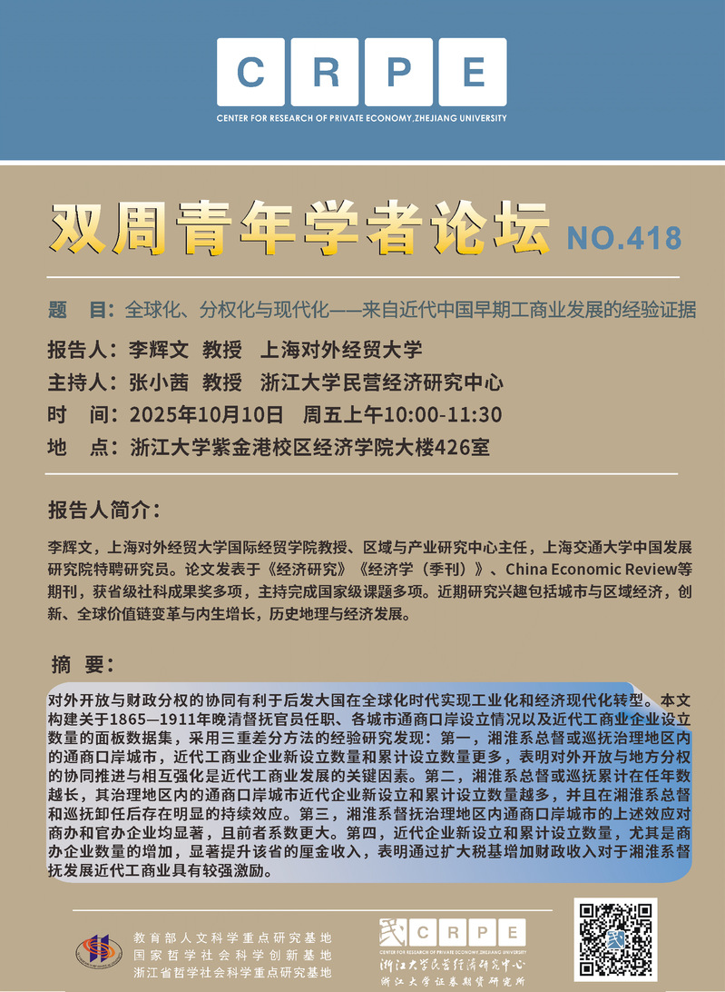【CRPE双周青年学者论坛NO.418】李辉文:全球化、分权化与现代化——来自近代中国早期工商业发展的经验证据