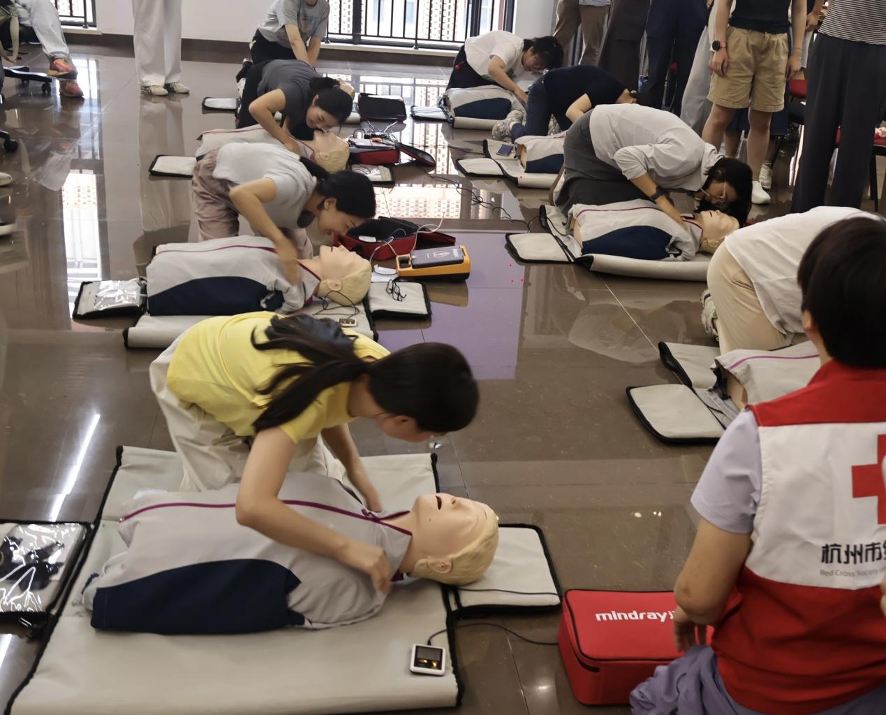 培训中,杭州市西湖区红十字会讲师重点围绕心肺复苏(CPR)、自动体外除颤器(AED)使用及海姆立克急救法展开教学。讲师先阐释心脏骤停识别要点,明确胸外按压、人工呼吸的规范要求,再结合AED实物设备演示了操作全流程;随后通过动作拆解与示范,帮助参训人员掌握不同场景下的海姆立克急救技巧。