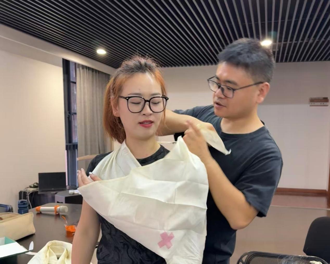 结合校园及日常生活常见伤情类型,区红十字会讲师还开展了创伤救护教学,围绕膝盖等关节部位常见擦伤、扭伤,讲解环形包扎、螺旋形包扎方法;针对断掌断指、肩部损伤等复杂伤情,详细教授三角巾包扎折叠方式、固定要点。随后,参训人员两两分组模拟施救场景开展包扎练习,在实操中建立规范急救思维,为伤者提供初步有效处理。
