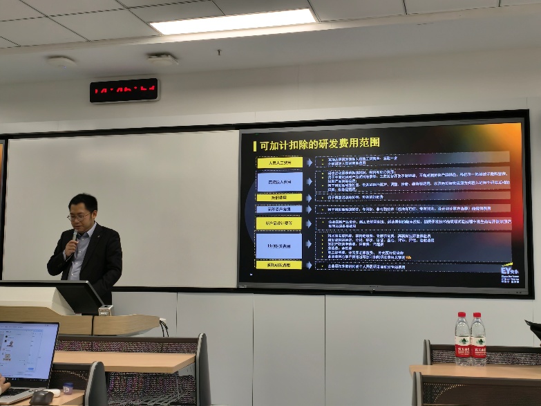 讲座伊始,负责税收案例分析企业所得税板块的徐中音女士首先为同学们介绍了后续讲座安排,强调了研发费用加计扣除的复杂性与其在企业所得税条线业务中的重要地位。本次请到的主讲人罗思维先生是安永税务量化咨询服务总监、资深税务专家,拥有超过12年中国税务咨询及研发类项目服务经验,专注于研发费用加计加除、高新技术企业申请、技术先进型服务企业认定及税务稽查应对等领域。他深耕互联网、软件、先进制造业、生物医药等多个行业,曾为众多国内外企业提供研发活动合规管理、费用归集及内控体系建设咨询,并参与地方税务机关核查手册编制工作,熟悉税务实践焦点。