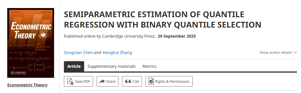 10 2025年9月,我院陈松年教授的3篇论文分别发表于计量经济学领域顶级期刊Journal of Econometrics(2篇)和Econometric Theory(1篇)。以下为论文详细信息: