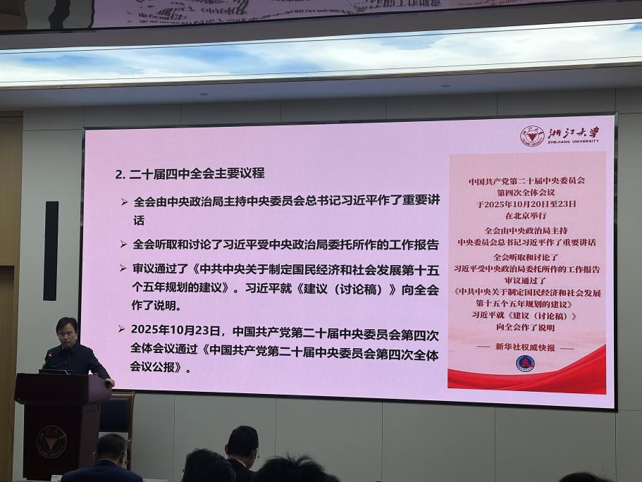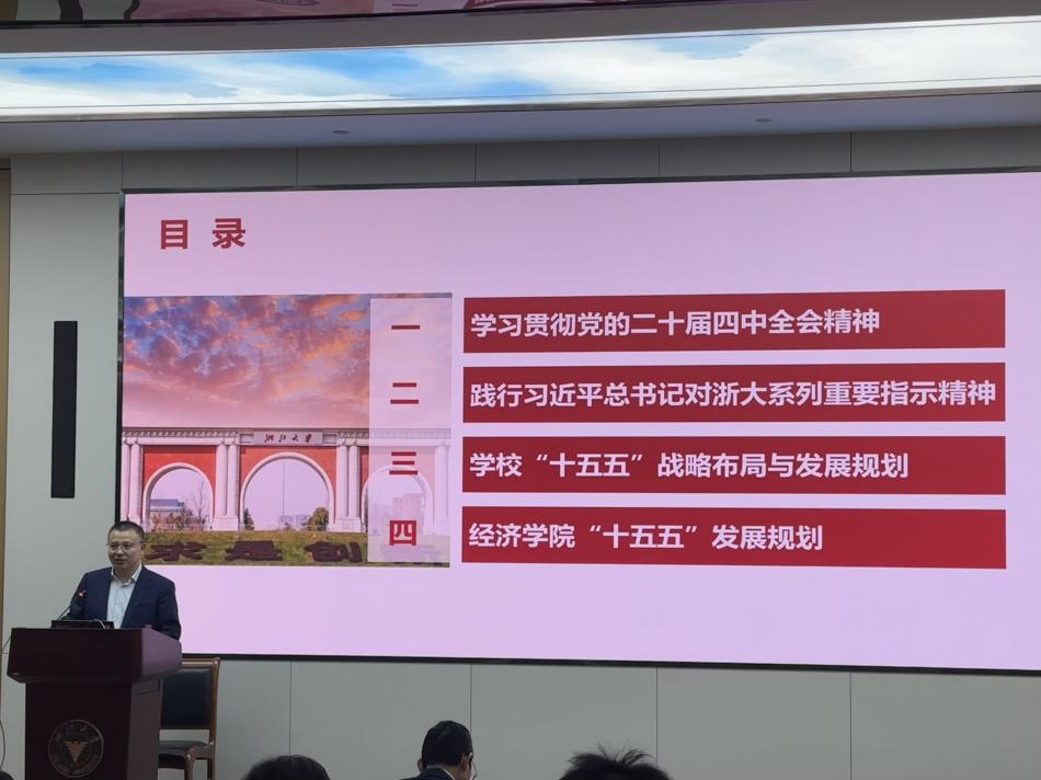 首先,经济学院党委书记王义中老师作题为《牢记殷殷嘱托,共绘“十五五”宏伟蓝图,加快世界一流大学前列建设步伐》的主题报告。王书记对学习贯彻党的二十届四中全会精神、践行习近平总书记对浙大系列重要指示精神、学校及学院“十五五”战略布局与发展规划进行了重点讲解。王书记强调,要切实把全院师生的思想和行动统一到习近平总书记重要讲话精神和党中央决策部署上来,将全会确定的各项目标任务落到实处,切实把全会精神转化为加快建设世界一流大学和优势学科的生动实践。