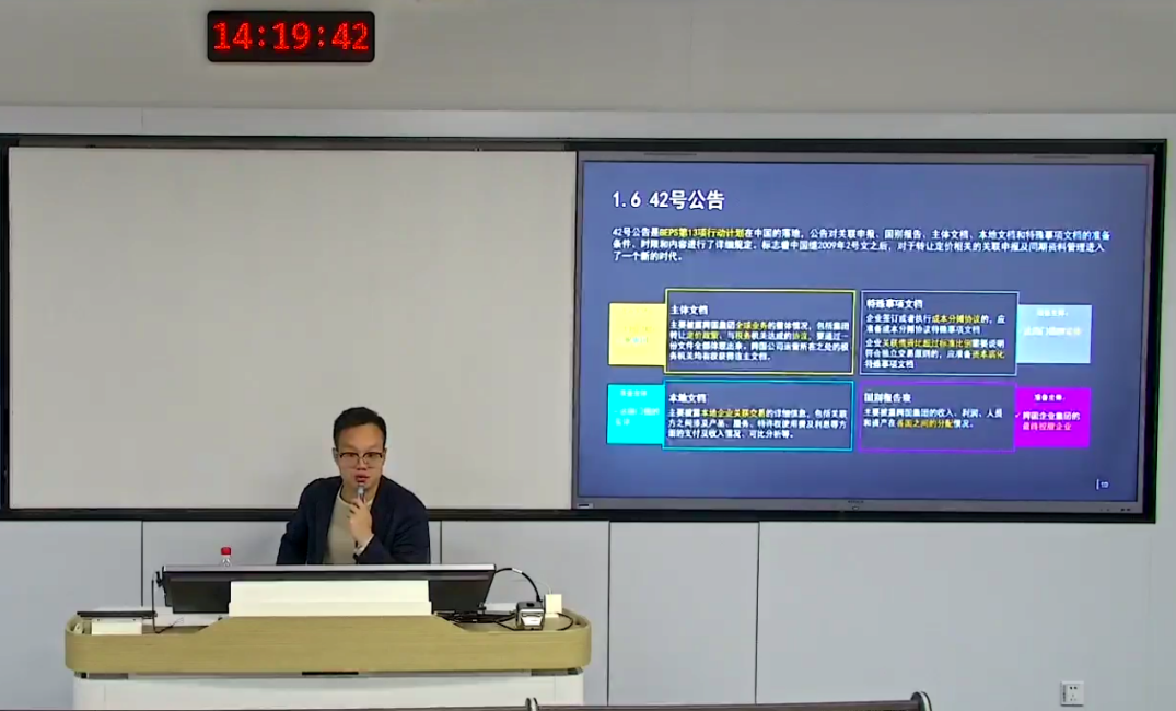 在合规管理部分,方佳恩先生详细介绍了中国三层文档体系,并说明了不同文档的准备门槛。他指出,文档不仅是监管要求,更是企业在面对税务调查时最重要的证据链,应当提前准备、真实披露。他还简要介绍了关联申报表的结构,并提醒学生关注申报表内部的逻辑一致性,尤其是利润与功能是否匹配、资金结构是否合理等。
