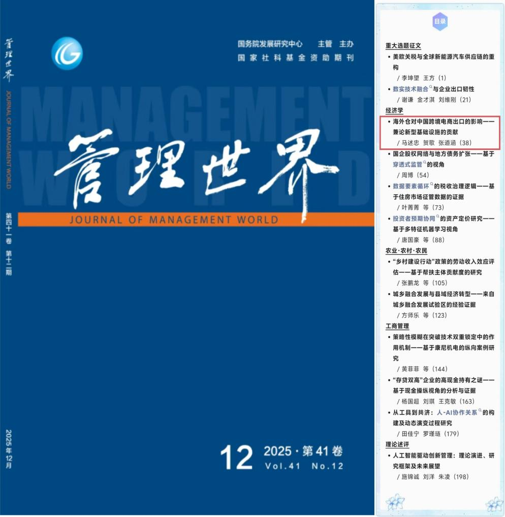 19 近日,浙江大学经济学院马述忠教授、西安交通大学经济与金融学院助理教授贺歌和浙江大学经济学院博士生张道涵的合作论文《海外仓对中国跨境电商出口的影响——兼论新型基础设施的贡献》在《管理世界》2025年第12期正式发表。