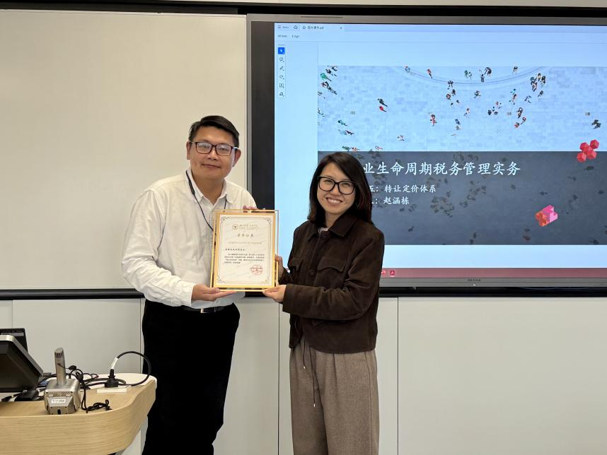 本次讲座赵涵栋先生聚焦企业生命周期中的转让定价体系,既系统解读了国际税收原则、OECD“双支柱”方案等前沿动态,又结合典型案例与国内实践,详解转让定价评估方法及行业应用重难点,内容兼具理论深度与实务指导性,为在场师生带来专业启发,讲座尾声赵涵栋先生与同学们合影留念,本次讲座圆满落下帷幕。