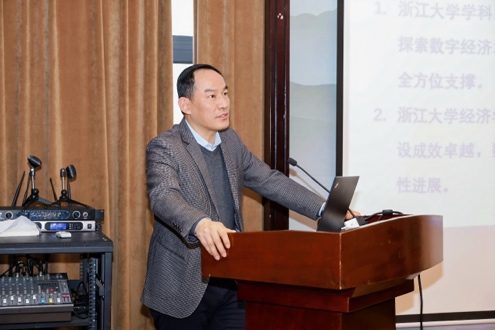 随后,经济学系主任叶建亮对数字经济专硕项目进行了详细的介绍,他强调了数字经济专业的交叉性,对浙江大学经济学院数字经济专业硕士课程体系和学院老师进行了介绍,并对数字经济学科建设和人才培养目标进行了展望。