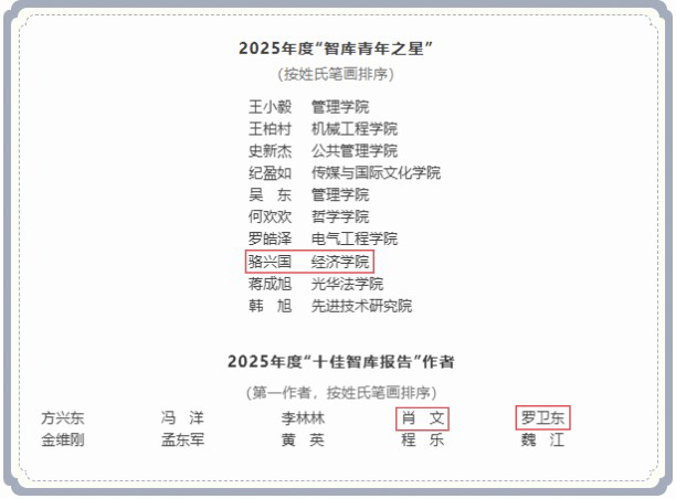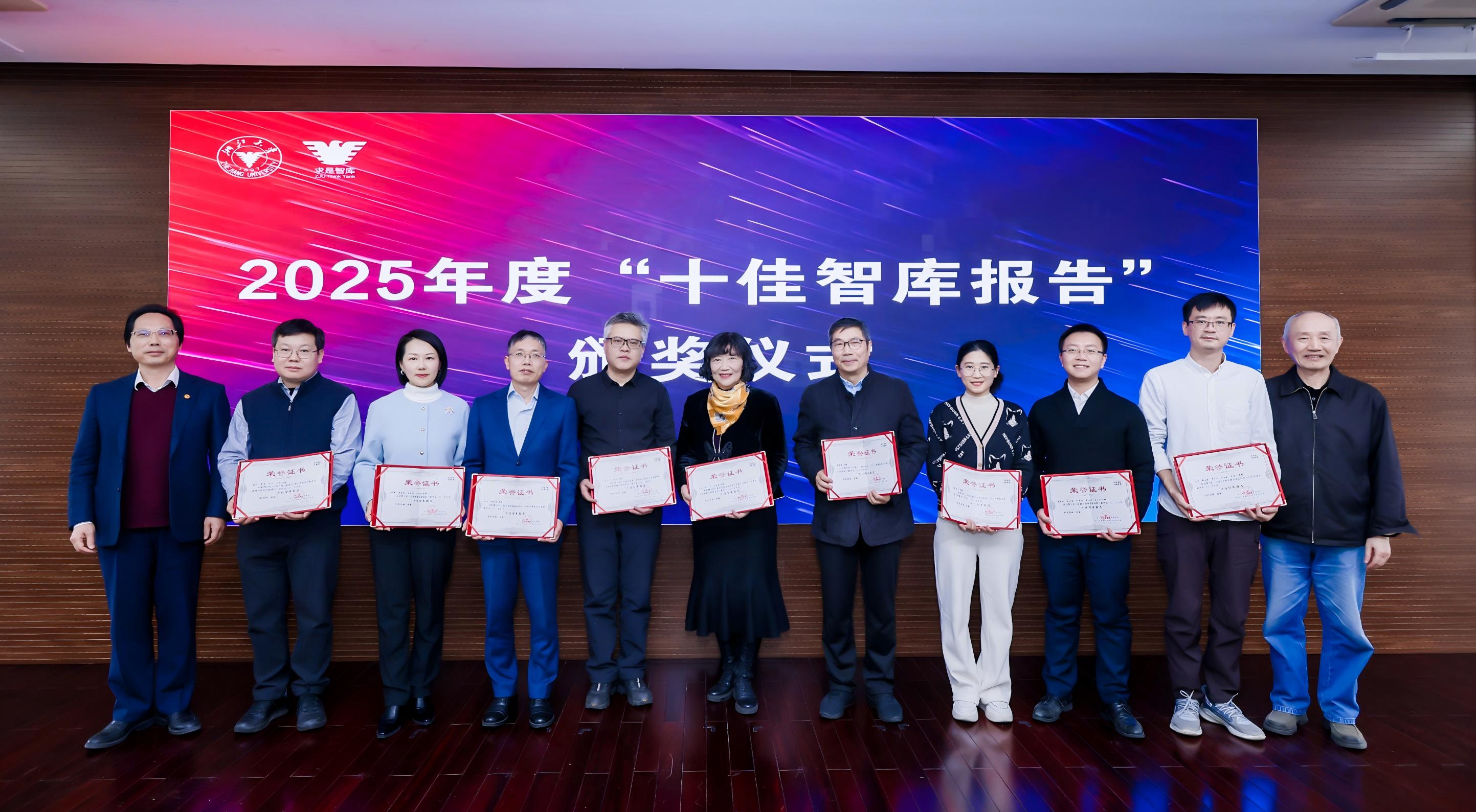 会议公布了2025年度浙江大学“智库青年之星”和“十佳智库报告”评选结果。我院骆兴国教授荣获2025年度浙江大学“智库青年之星”称号。肖文教授与罗卫东教授荣获2025年度“十佳智库报告”作者称号。智库建设领导小组副组长、经济学院教授黄先海出席会议并为获评“十佳智库报告”教师颁发证书。